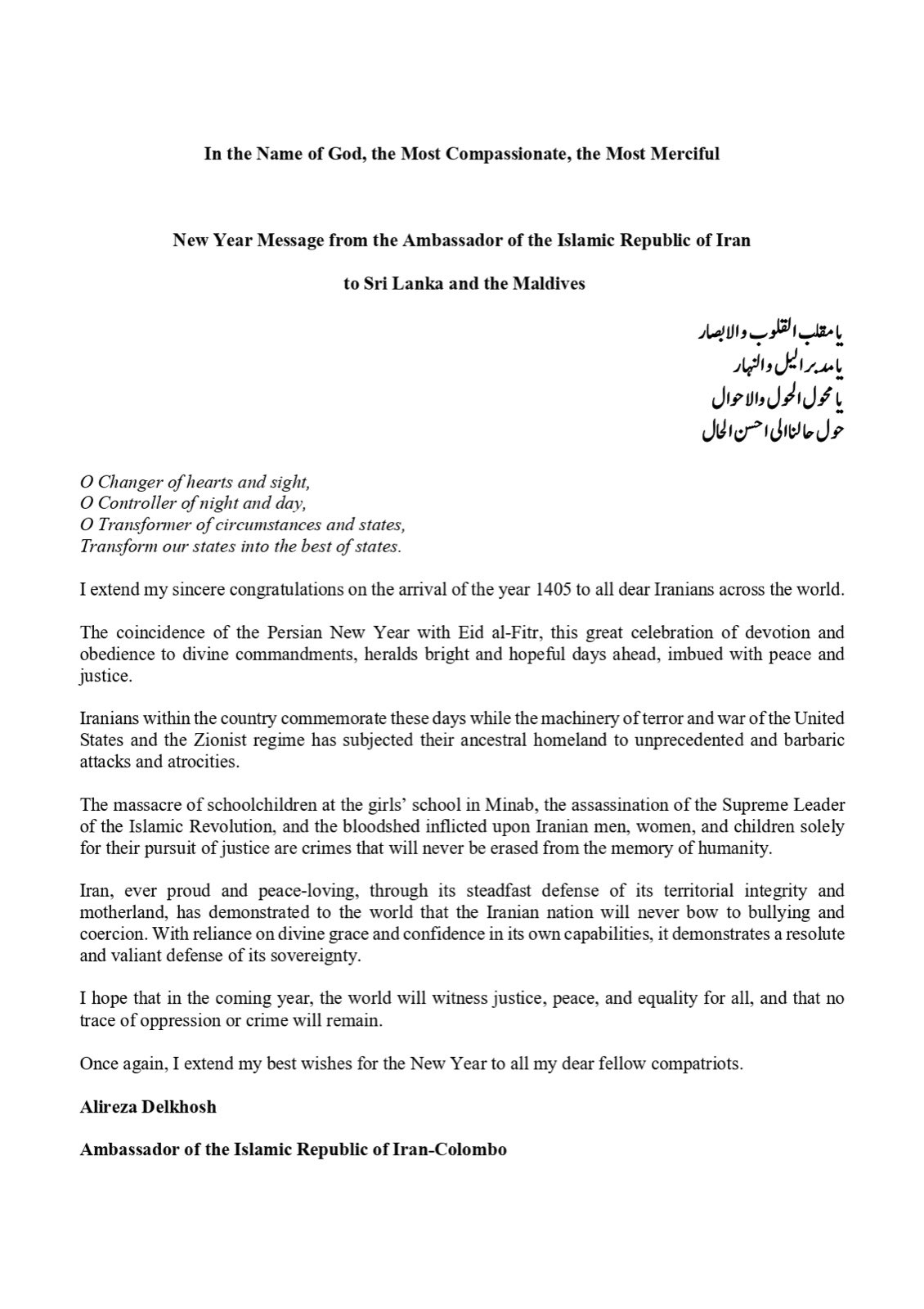 H.E Dr Alireza Delkhosh's Iranian New year message
