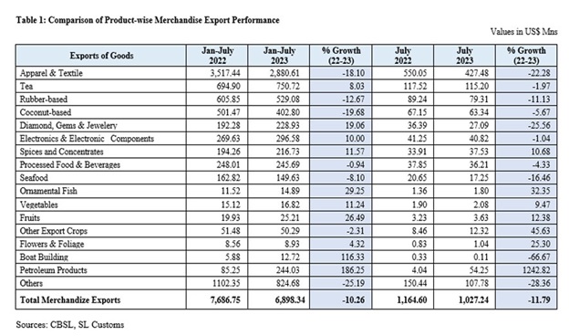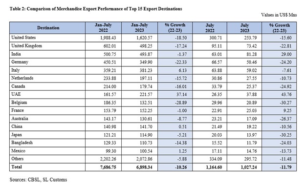 Out of the top 10 export markets, only UAE has shown strong performance during July 2023 and the period of January to July 2023 compared to the corresponding period in the previous year.