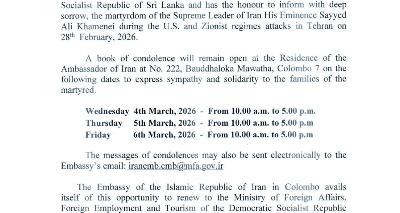 Iran Embassy Condolence message on the martyrdom of the Supreme leader Ayatollah Khamenei